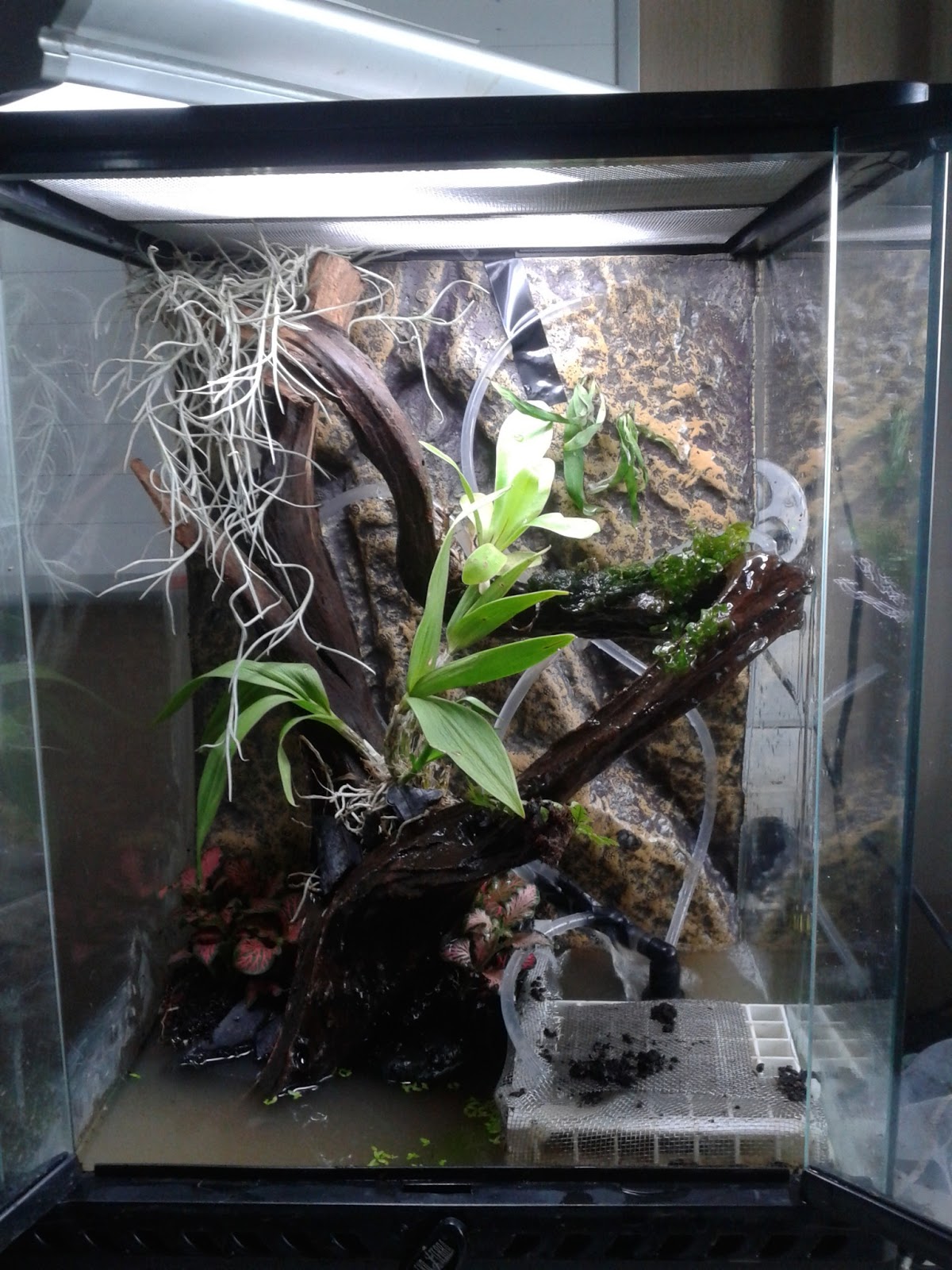 I've got some cautions to bring up. In months time, your white tree frog will be fatter, heavier and bigger and your beautiful flora(Orchid ) will soon rip apart one by one . The orchid will not be able to withstand the weight and its massive strength of your beloved frog . That's why I use mainly artificial flora ..mind you I got at least 10 WTFs to take care.