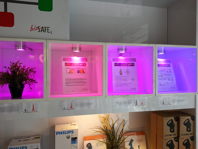 Just changing the color of lights may not necessarily create the correct combination of spectrums for growing plants. LED lights usually have to be tuned to output certain plant-growth specific light spectrums (which we may not be able to see) so that plants can use more of the light efficiently, or else most of the light is wasted (and encourage algae to flourish instead).
