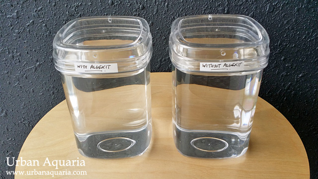 Since i had a fair bit of extra AlgExit solution leftover, i decided to do a side-by-side comparison test of the effects of this algae treatment to see the difference between tank water samples that have it added versus those that don't have any treatment.