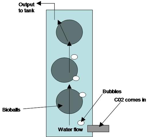 pic is wrong, your suggestion is the commonly used design, except the part about making the bubbles rising up (you didn't think you could come up with an innovation so easily, did you :P ). Bubbles entering from below will probably be swept directly towards the outlet beside them. I suppose if you adjust flowrate really carefully and play around with the diameters of the reactor and the pipes, you can avoid this, but in US I think they just intro the bubbles from the middle of the reactor length instead.