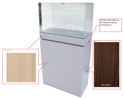 Initially, I was thinking the fish tank can just be put on any kind of surface like table or side table. After some thoughts, I believe it would be better to take the "tank load" more seriously and I had a plan to just buy a rough iron rack to put the fish tank on. I had try to source for second hand rack on carousel website for that. However, it can be seen most of the 2nd hand rack are quite high, about more than 1m which I feel not really nice put it in the living room. Then I changed my mind to source for the cabinet instead. There are many options of fish tank cabinet on the market and the price is also quite attractive. However, the ready-made cabinets do not have the colour that match my woodwork furniture at home. So the only option is to order a custom-made cabinet.