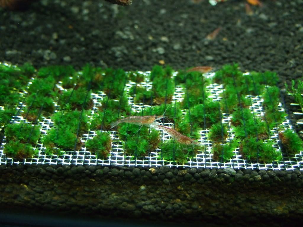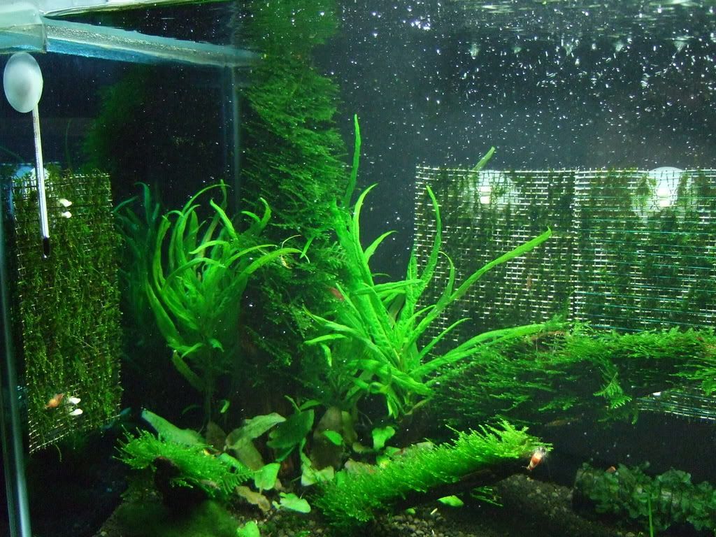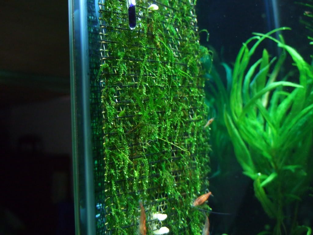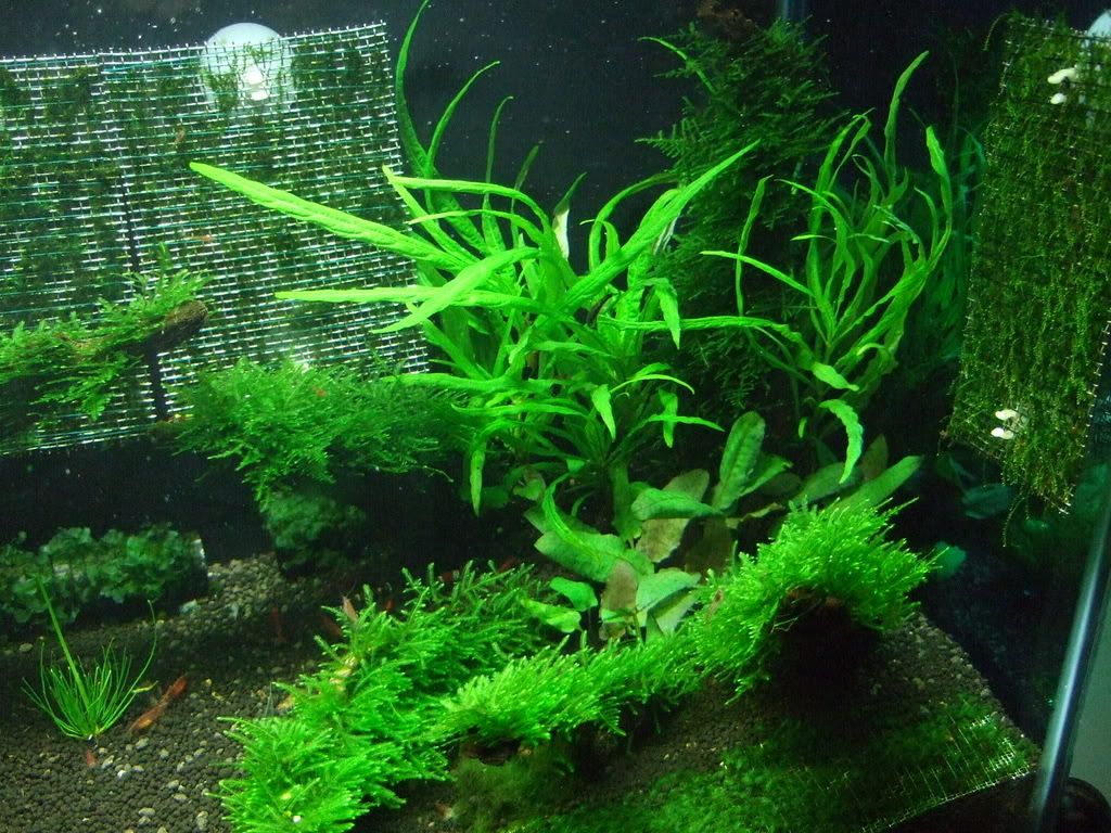flora: Spiky moss( on all wood) us fissiden ( on foreground mesh and back wall mesh) weeping moss( on 2 mesh on side wall) Star moss aka zhen zhu moss( on mesh) freshwater seaweed( on charcoal bamboo) un-IDed back ground plant. Crypt wenditti and marimo moss ball.