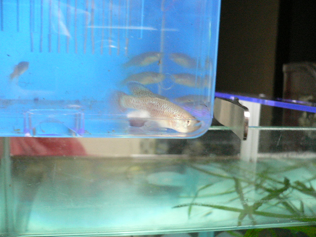 Tyron, I know when it growthup will be completely red in colour. (Seen a picture some where some how.) Now it is in transistion period the most ugly stage of its development. But looking at the bigger one that has not fully colour up. Its size scares me. If i put the Rachovii Nicuadala in they sure will take them as supper.