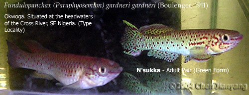 Fp. gardneri (GAR) from different collection locations have thus been kept pure, and genes not mixed. One former GAR is now known to be a different species, entirely (Fp. nigerianus). If you cross GAR from different collection locations, they may be perfectly viable and do no harm. Just keep the offspring as "aquarium strain" and never, ever, use one of the original locations to identify them after that. They may carry subtle tendencies to infertility, so we don't want to lose our N'sukkas and Akures, like we did some lovely species in the '70s.