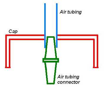 Drill a hole slightly smaller than the diameter of your air tubing so you get a snug fit. On the inside of the cap, firmly press in a tubing connector.