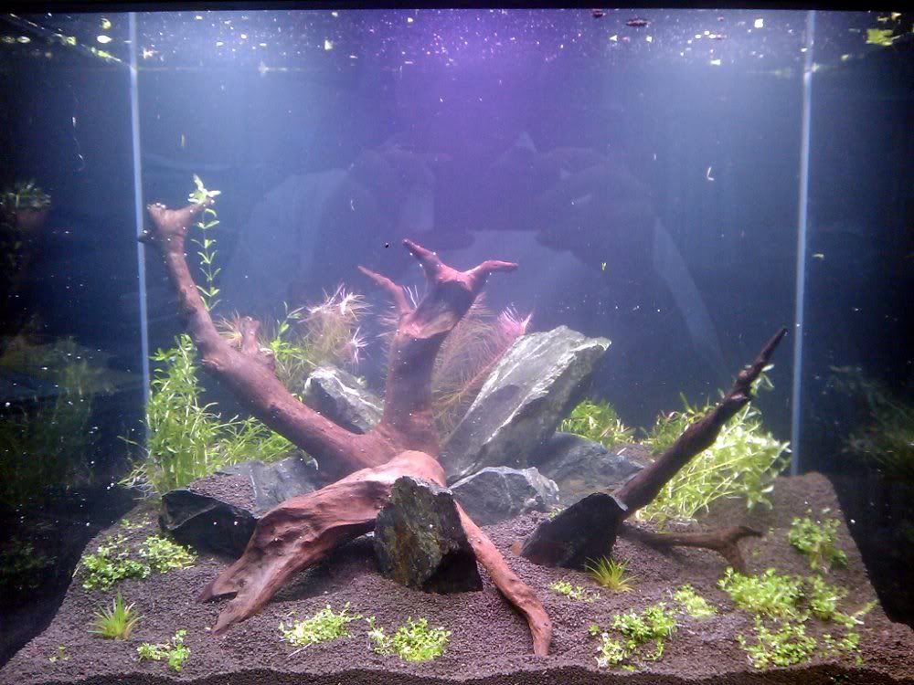 I really like the wood. Looks very nice! But i find the rocks seem to lack the kind of character to add depth to the scape. The rocks look more like slabs, thus it makes the scape look slightly unnatural. Maybe if you can change the rocks to something that has more contours it might help to enhance the overall look of the hardscape.