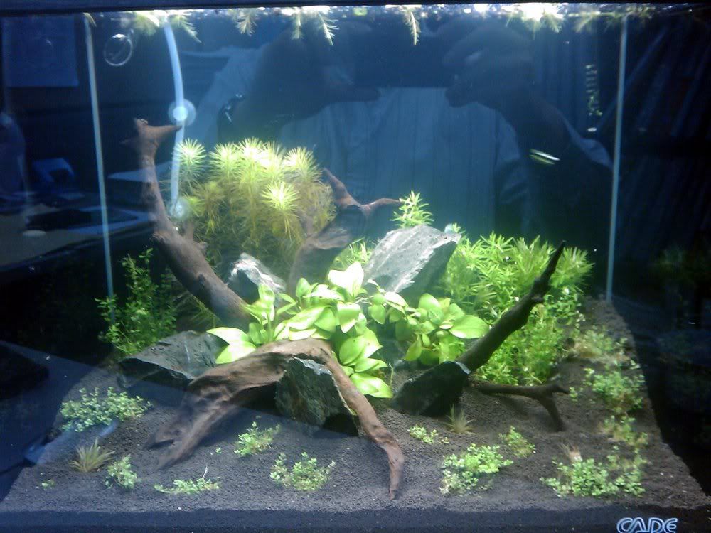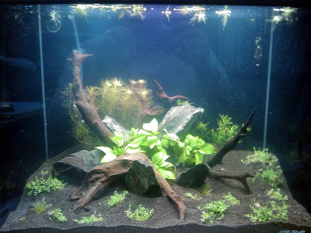 ThanksI chose the nana gold because I had like 5 pots lying around at home in my spare tank with nowhere to put them! I'll consider replacing them with nana petite. Thanks for your comments about the rocks...I agree with you that they aren't shapely enough...but i think I'll have to leave them where they are. Hopefully when the plants grow they will soften the entire effect. Appreciate the comments =)