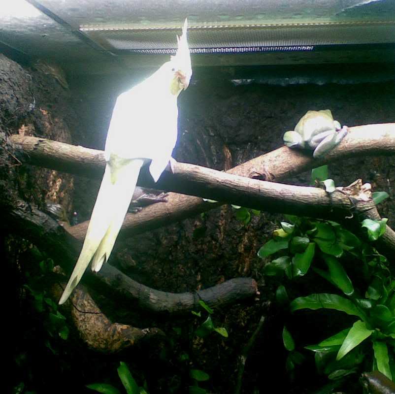 Here's your "Darling" (lutino cockatiel)... hope you're not thinking of having it live inside the froggies' home!