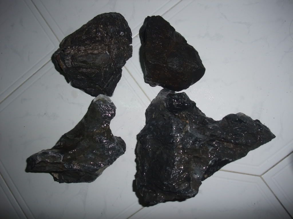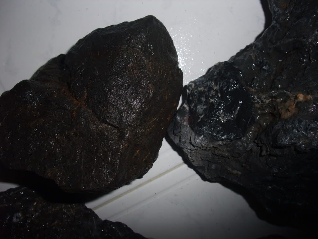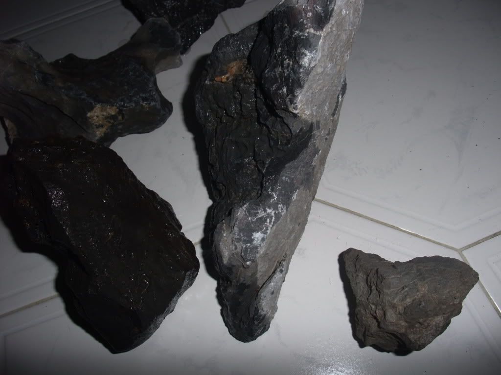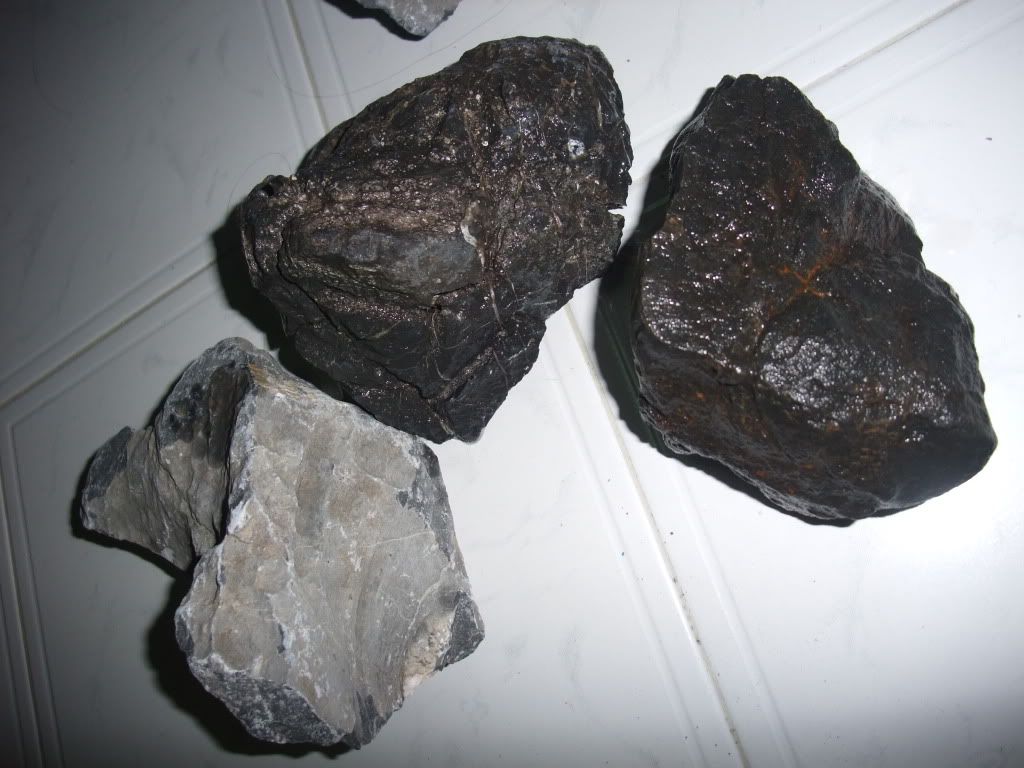 Here are 3 of the smaller rocks. Left - Dark. Top - Dark below but with thick layer of whitish stuff. Right - Almost entirely white