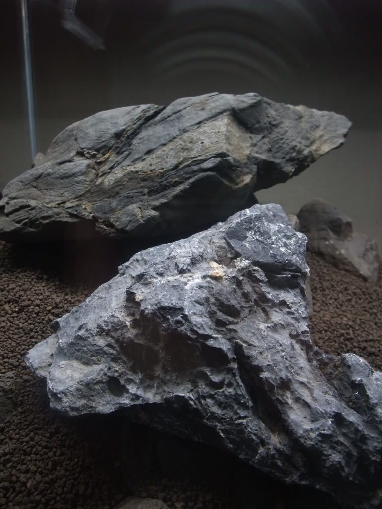 Here's a shot of the new cleaned Seiryu-like rock in the tank, dry, next to a newly cleaned old rock.